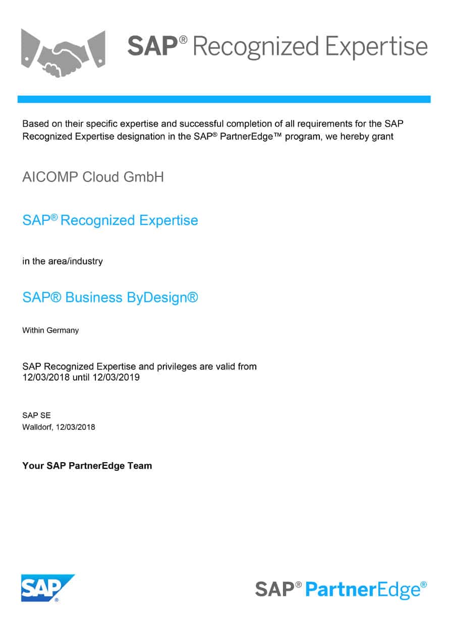 “SAP Recognized Expertise” ist ein Zertifikat, das im Rahmen des SAP PartnerEdge-Programms erteilt wird. Um die Auszeichnung für den Fokusbereich SAP Business ByDesign zu erhalten, muss ein SAP-Partner nachweislich unterschiedliche Anforderungen erfüllen. Dazu gehören erfahrene und qualifizierte Berater im Unternehmen sowie eine zuverlässige und effektive Implementierung von SAP-Business-ByDesign-Lösungen für Kunden. Auch eine gute Geschäftsentwicklung der SAP-Partner ist eine grundlegende Voraussetzung für die Bescheinigung der SAP Recognized Expertise.